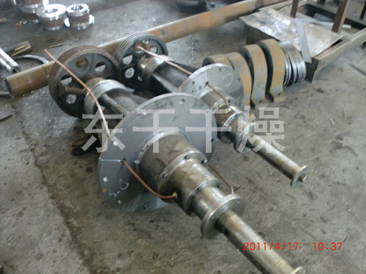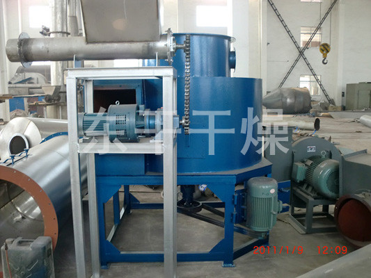 熱空氣切線進(jìn)入干燥器底部,在攪拌器帶動下形成強(qiáng)有力的旋轉(zhuǎn)風(fēng)場。膏狀物料由螺旋加料器進(jìn)入干燥器內(nèi),在高速旋轉(zhuǎn)攪拌槳的強(qiáng)烈作用下,物料受撞擊、磨擦及剪切力的作用下得到分散,塊狀物料迅速粉碎,與熱空氣充分接觸、受熱、干燥。脫水后的干物料隨熱氣流上升,分級環(huán)將大顆粒截留,小顆粒從環(huán)中心排出干燥器外,由旋風(fēng)分離器和除塵器回收,未干透或大塊物料受離心力作用甩向器壁,重新落到底部被粉碎干燥。